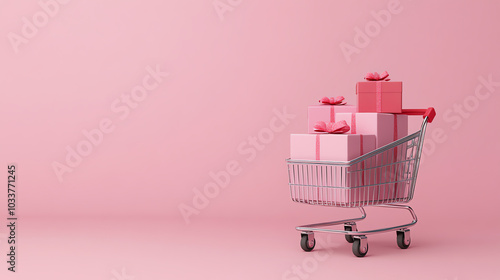 A shopping cart filled with pink and red gift boxes on a soft pink background, perfect for celebrating special occasions and festive moments.