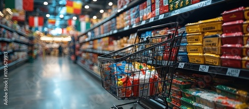 A Shopping Cart Filled with Snacks in a Grocery Store Aisle