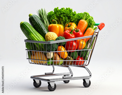 A shopping cart overflowing with fresh and colorful vegetables promoting healthy eating and groceries on white background