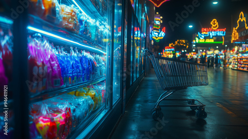 night, city, street, supermarket, shopping cart, food market, neon, light, urban, empty, abandoned, glasses, retail, food, display, aisle, product, cardboard box, shelf, frozen food, illumination, dark, deserted, sidewalk, blue, night time, commerce, consumption, consumerism, shopping, ai