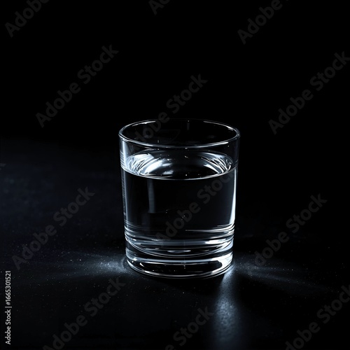 A short glass beaker containing a very dark, almost black, liquid is placed on a dark surface.