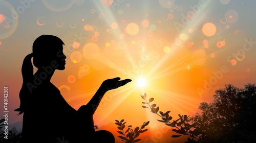 silhouette, sunrise, meditation, serenity, peace, vibrant, background, morning, calmness, zen, wellness, spiritual, nature, calm, sun, mindfulness, harmony, orange sky, dawn, new day, balance, sunlight, contemplation, relaxation, sun ray, bokeh, profile