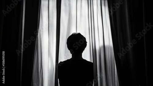 silhouette, window, curtain, person, looking, mystery, isolation, light, dark, shadow, indoor, room, home, privacy, view, thoughtful, contemplative, alone, lonely, hope, waiting, dreaming, future, thought, gaze, face, head, body, shape, outline, black, white, contrast, monochrome, photo, art, image, graphic, design, abstract, minimal, simple, elegant, style, mood, feeling, emotion