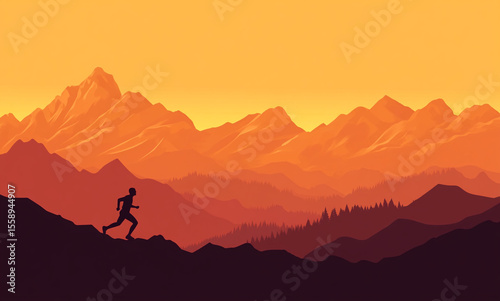 A silhouette of a person runs uphill against a vibrant orange and yellow sunset. Majestic mountains and dark trees frame the scene, depicting determination.