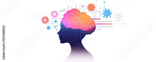A silhouette of a woman with a colorful brain illustration, symbolizing creativity and mental processes, surrounded by abstract shapes.