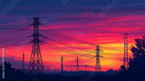 A silhouette of high-voltage power lines and towers against a stunning sunset, with the vibrant colors of the sky contrasting with the dark outlines of the infrastructure.