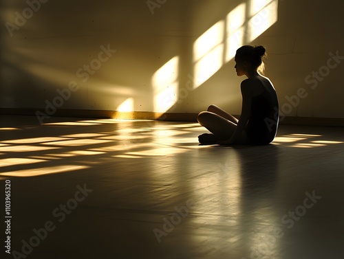 A silhouette sits thoughtfully in a sunbeam, casting dramatic shadows across the floor, embodying introspection and a moment of solitude
