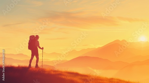 A silhouetted hiker stands on a mountain at sunset, capturing the beauty of nature and adventure in a peaceful landscape.