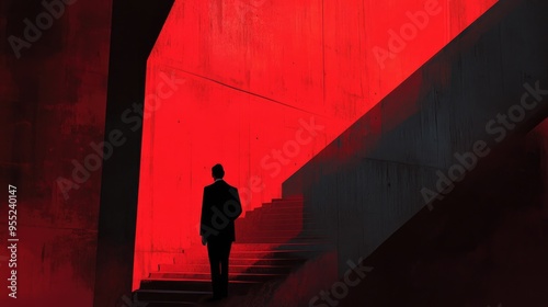 man, silhouette, stair, concrete, room, red, light, dark, shadow, standing, hallway, building, architecture, interior, grunge, textured, wall, up, down, perspective, angle, modern, abstract, minimalist, graphic, art, artwork, digital, paint, brushstroke, illustration, design, style, mood, atmosphere