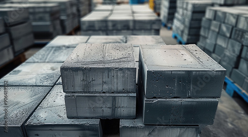 A silicon carbide bricks neatly stacked, some blocks are aligned while others are slightly off. The background is an industrial warehouse with metallic racks. Generative AI.