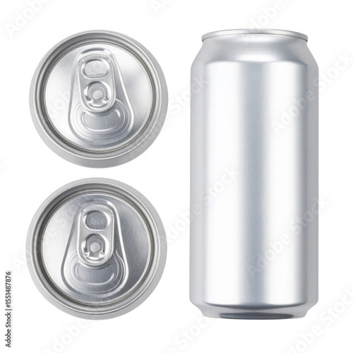 A silver aluminum beverage can with a pull-tab top shown from three angles: side, top, and bottom.