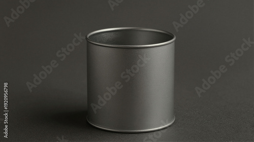 A silver, cylindrical metal can with a smooth finish sits on a plain gray surface under soft lighting.