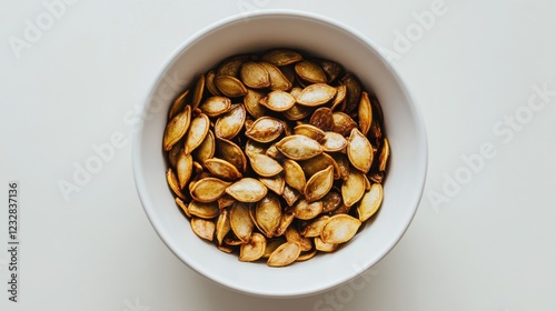 simple, bowl, lightly, salted, roasted, pumpkin, seed, served, minimalist, white, ceramic, centered, soft, natural, lighting, golden brown, colours, texture, clean, additional, element