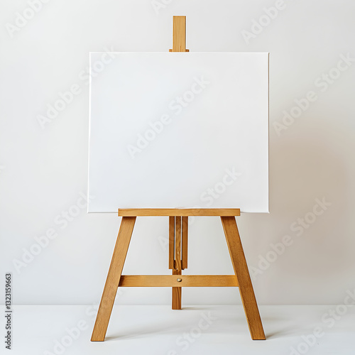 A simple canvas on a wooden easel, displaying a blank surface, set against a white background