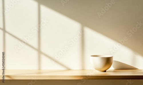 bowl, ceramic, shelf, wooden, light, shadow, window, cream, wall, beige, minimalist, simple, still life, indoor, interior, decoration, design, soft, calm, peaceful, zen, meditation, studio, table, surface, clean, blank, empty, copy space, presentation, display, product, sunlight, daylight, room, domestic, architecture, furniture, contemporary, modern, style, background, neutral, warm, element, shape, nobody