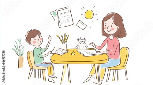 A simple drawing of a mother or teacher helping children with their homework. The image shows the importance of education and caring for children's learning.