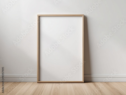 A Simple, Elegant Blank Photo Frame Leaning Against a Wall in a Minimalist Interior Setting with Warm Wooden Flooring