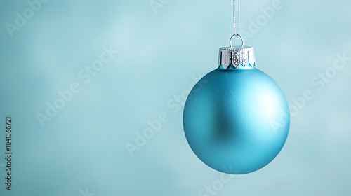 A simple, elegant blue Christmas ornament hanging from a silver string against a soft, pale background. The minimalist composition highlights the festive spirit