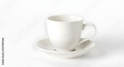 A Simple Elegant White Ceramic Cup with a Matching Saucer, Set Against a Clean, White Background