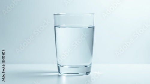 A simple glass of clear water sits on a pristine white surface against a pale blue backdrop