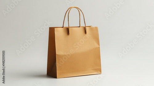 A simple kraft paper bag with thin handles on a plain white background