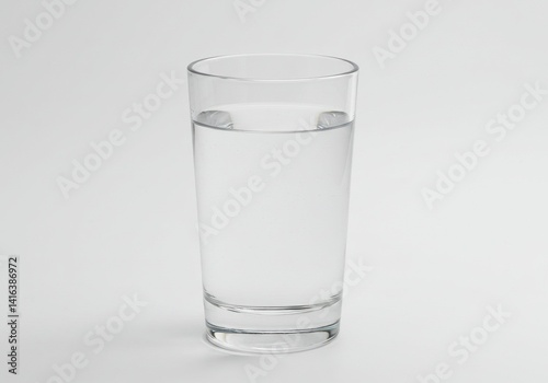 A simple shot of a clear glass filled with transparent liquid against a white background in studio light