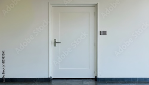 a simple white door stands centered against a pale wall with a modern silver door handle and a small ventilation grate nearby, all set above a dark tiled floor.