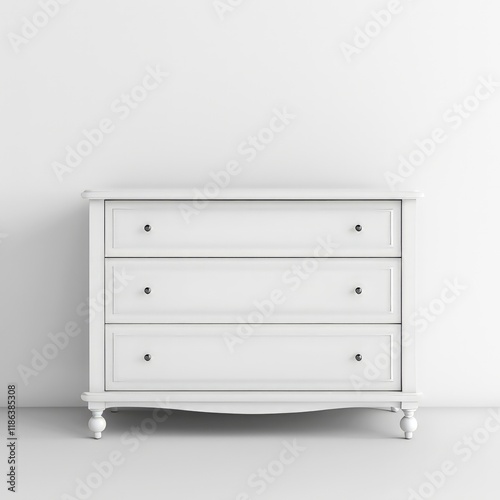 A simple white dresser with three drawers, suitable for storage and home decor. isolated on white background