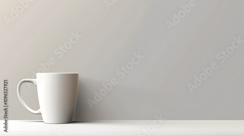 A simple white mug sits on a white surface against a minimalist gray backdrop.