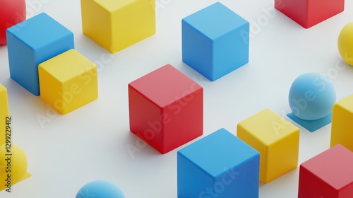 A simple yet vibrant minimalist scene with isometric cubes in bright primary colors red, blue, and yellow on a white background