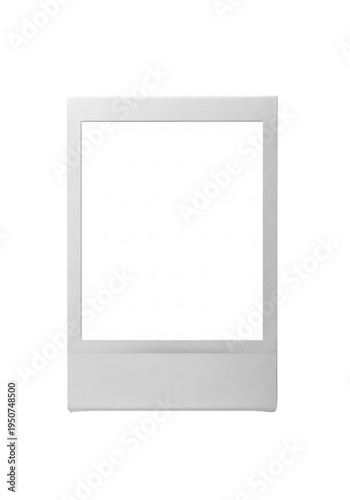 A single, blank, vertically oriented instant photo frame with a white textured border, featuring an empty transparent center, isolated on a seamless, transparent studio background with copy space,
