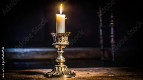 A Single Candle Burning in a Brass Candlestick on a Wooden Surface
