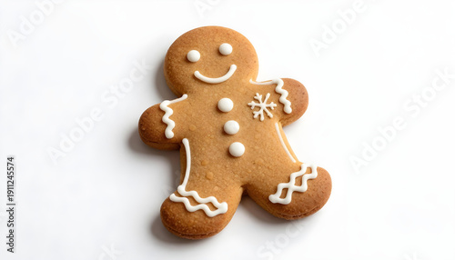 A single gingerbread man cookie with white icing decorations on a plain white background