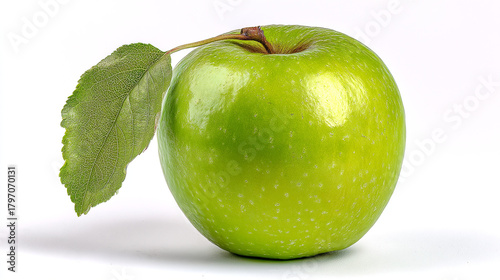 apple, green, fruit, leaf, stem, white background, studio shot, single, fresh, healthy, food, produce, isolated, closeup, still life, nourishment, organic, raw, vegetarian, vegan, crisp, sweet, juicy, delicious, vibrant, nature, natural, garden, agriculture, harvest, diet, ingredient, macro, detail, texture, smooth, shiny, round, whole, plant, flora, foliage