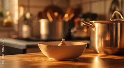 garlic, bowl, kitchen, counter, sunlight, cooking, food, preparation, fresh, organic, natural, simple, warm, morning, light, home, interior, wooden, table, still life, closeup, detail, healthy, delicious, meal, ingredient, soup, stew, aroma, favor, spice, rustic, kitchen utensile, homelike
