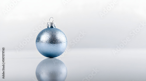 A single, light blue glitter Christmas ornament rests on a reflective white surface. Minimalist holiday decoration. Perfect for winter or holiday themed projects.