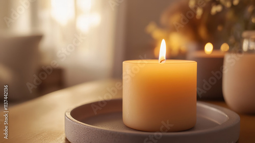 A Single Lit Candle on a Tray in a Cozy Room Setting