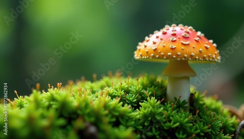 A single orange and green mushroom cap on a bed of moss, mushrooms, cap, fungi