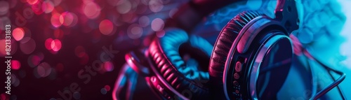 A single pair of headphones with imaginative elements, a unique background, and advanced themes to evoke a sense of wonder with a blurry backdrop and copy space