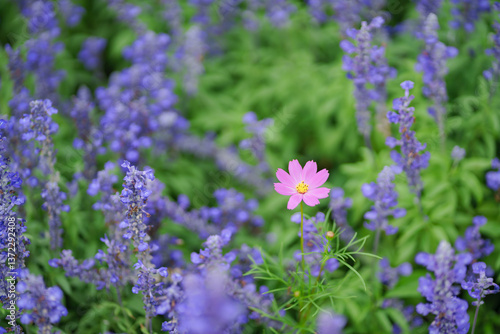 A single pink cosmos flower amidst a field of purple salvia, showcasing contrasting colors and natural beauty. Perfect for floral, nature, and garden concepts.