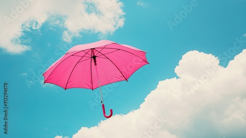 A single pink umbrella standing out against a background of blue sky and puffy white clouds.