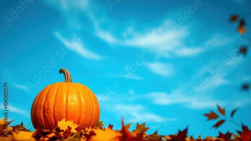 A Single Pumpkin Resting on a Bed of Autumn Leaves Against a Vivid Blue Sky