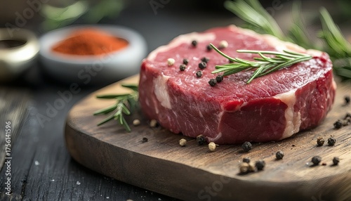 beef, steak, raw, meat, rosemary, peppercorn, pepper, spice, seasoning, food, photo, cooking, culinary, delicious, epicure, receipe, eatery, dinner, lunch, red, brown, green, wooden, board, cutting, dark, rustic, texture, closeup, detail, fresh, aromatic, flavorful, juicy, marbling, protein, healthy, appetising, gastronomy, still life, image, illustration, stock