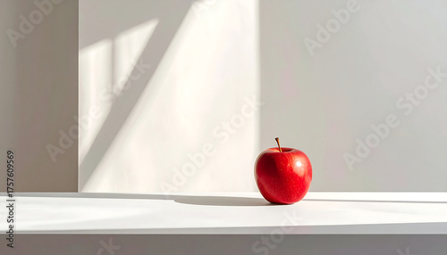 A single red apple isolated on a neutral surface in soft natural light. Minimalistic image symbolizing health, simplicity, and natural beauty