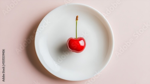 A single red cherry with a stem on a white plate against a pink background