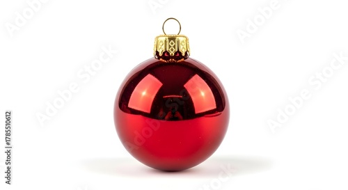 A single shiny red Christmas ball ornament with a golden cap isolated on a white background.