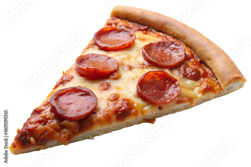 A single slice of pepperoni pizza with melted cheese is isolated on a transparent background ready to be enjoyed