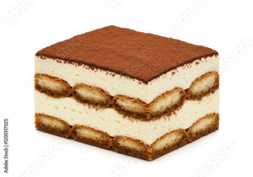A single slice of tiramisu cake with visible layers of creamy filling, sponge cake, and cocoa powder dusting on top isolated on white background