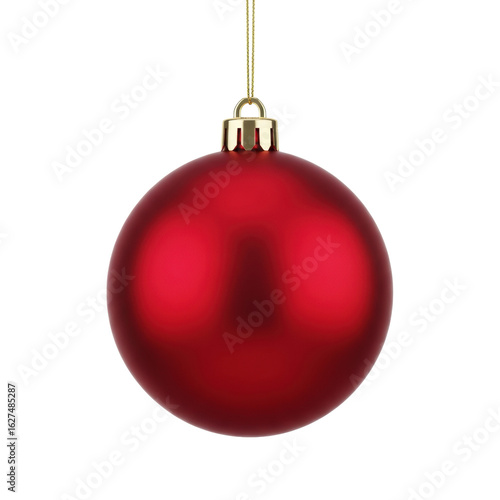 A single, spherical crimson red matte Christmas ornament with a delicate gold thread, suspended perfectly still against a transparent background with no shadows, concept of festive elegance