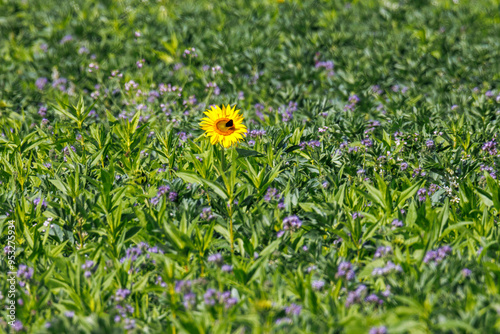 A single sunflower growing in a field of blue Phacelia flowers